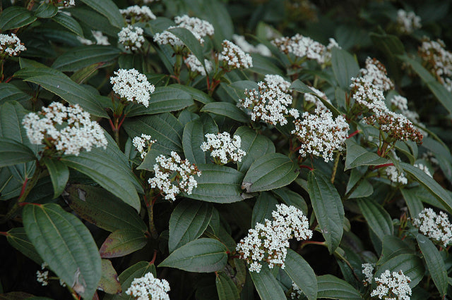 Pincushion Viburnum features showy white flat-top flowers at the ends of the branches in mid spring. The royal blue fruits are held in abundance in spectacular clusters in mid summer. It has dark green evergreen foliage which emerges green in spring. The glossy oval leaves remain dark green throughout the winter.
