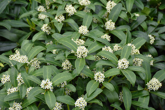 Reeves Skimmia features showy clusters of fragrant white flowers at the ends of the branches from early to mid spring. It has attractive green evergreen foliage. The small glossy oval leaves are highly ornamental and remain green throughout the winter. It features an abundance of magnificent red berries in mid fall.